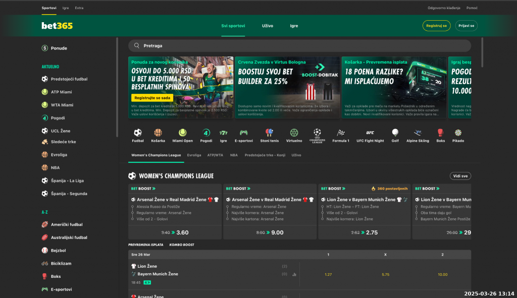 Када смо користили bet365, главни утисак је да је кладионица у првом плану, што се види већ на почетну страницу сајта. И са леве и са горње стране налази се мени са листом доступних спортова за клађење, док су испод стакнути актуелни bet365 бонуси за клађење, као и утакмице за које важе опције увећаних квота, односно бет буст. Даље испод су утакмице које су актуелне у понуди, као и бет билдер понуда карактеристична за бет365.