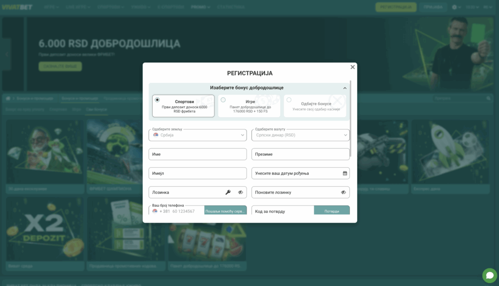 Тада се отвара засебан прозор, односно формулар у коме треба попунити податке. Што се тога тиче, основне информације су мејл и лозинка, коју је препоручљиво записати. Затим треба унети број мобилног телефона и код за потврду. Пре саме регистрације, можете одабрати какав бонус добродошлице желите.